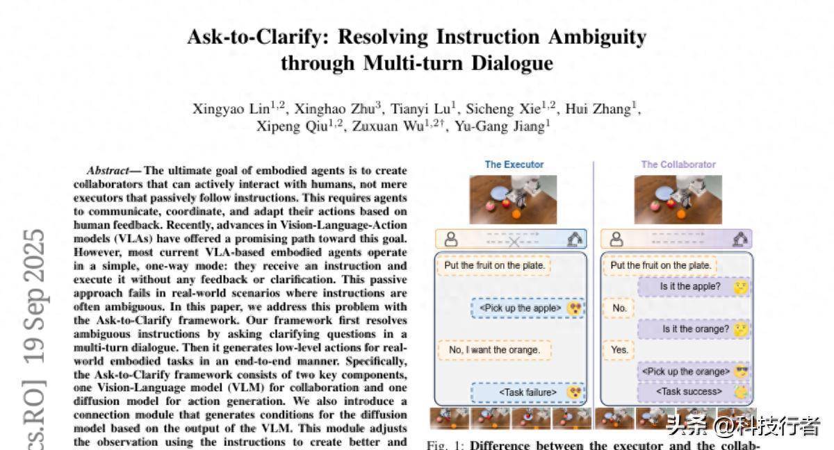 在我们日常生活中,当你对朋友说"把那个水果拿给我"时,如果桌上有好几种水果,你的朋友肯定会问"你要哪个?苹果还是橙子?"这种自然的澄清对话对人类来说再简单不过,但对机器人而言却是一个巨大的技术挑战。长期以来,机器人就像是只会按指令行事的执行者,面对模糊指令时要么随机选择,要么干脆罢工。而复旦大学这个研究团队的最新成果,让机器人首次具备了"问问题"的能力,真正从被动的指令执行者进化为能够主动沟通的合作伙伴。