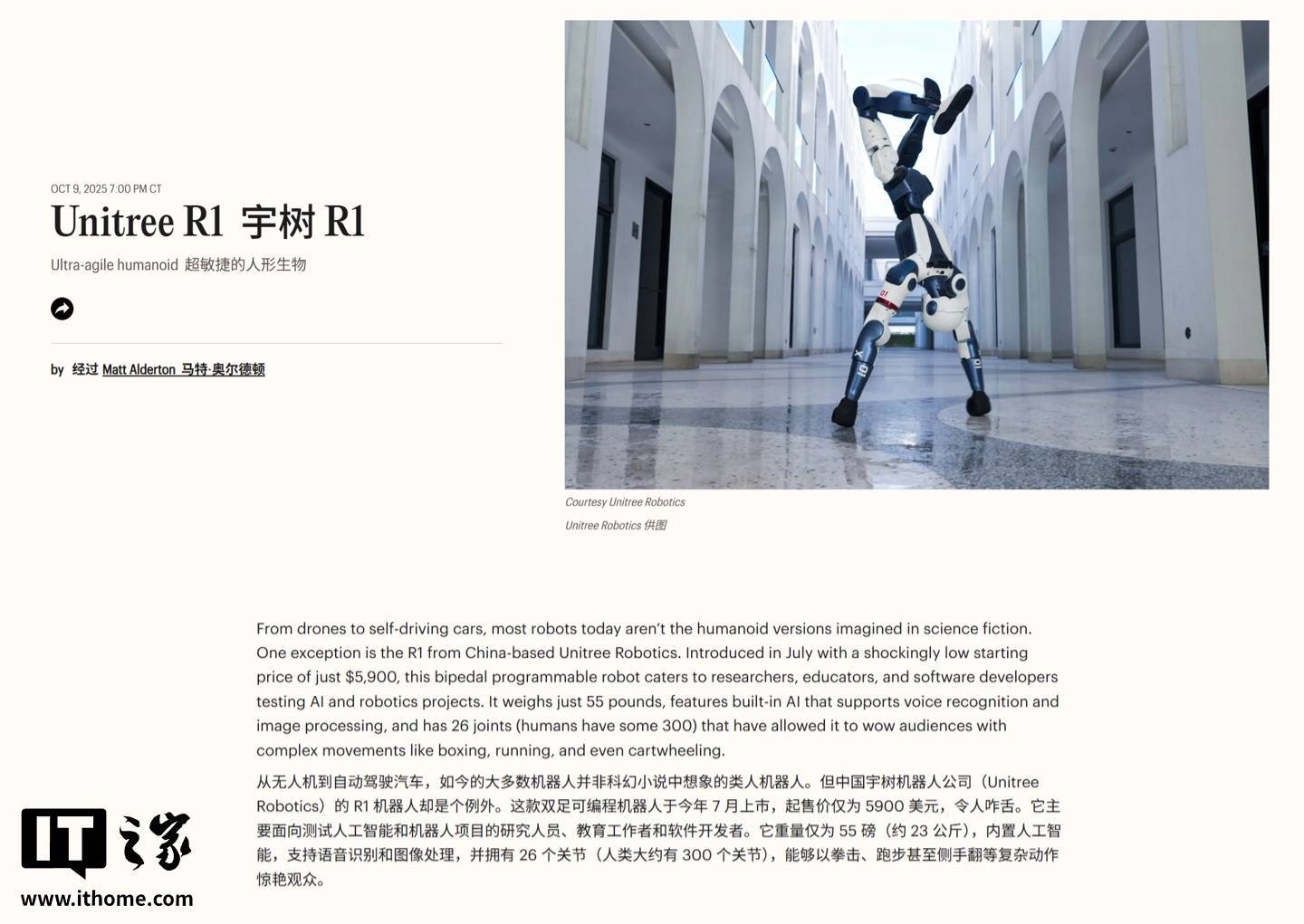 IT之家 10 月 10 日消息,《时代》杂志昨日(10 月 9 日)公布了 2025 年度最佳发明榜单,在机器人类目下,宇树旗下的双足人形机器人 Unitree R1 成功入选。